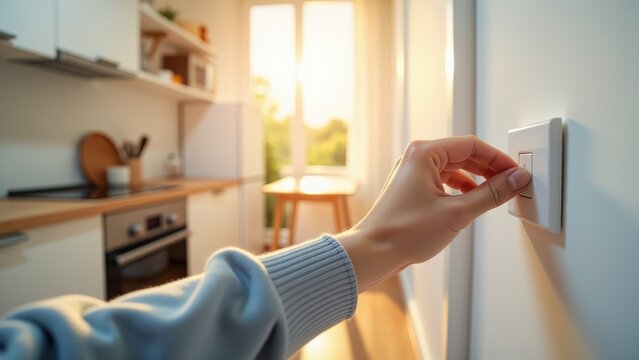 Hand turning off a switch, Hand reaching for light switch in well-lit kitchen