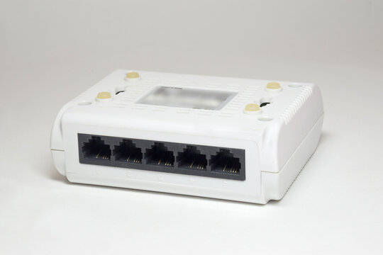 home network hub. 5-port fast ethernet unmanaged switch. white box with with transparent anti-skid silicon feets for installation on horizontal surface