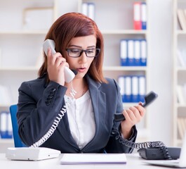 a happy, smiling woman as she efficiently works in a call center, creating a vibrant and dynamic professional atmosphere. Generative AI.