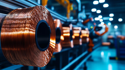 Copper wire rolls shimmer under the cool fluorescent lighting, with robotic arms in the background handling the production process.