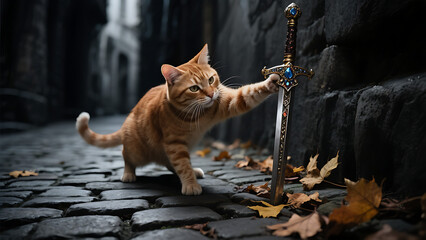 Ginger tabby cat playfully interacting with an ornate sword on a cobblestone street, autumn leaves scattered around, medieval fantasy concept