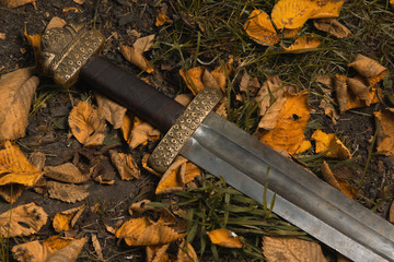 Rusty sword lying in snowy forest clearing among fallen leaves