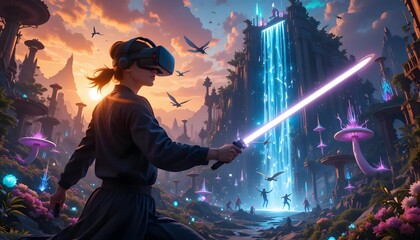 Futuristic swordswoman navigates a VR realm