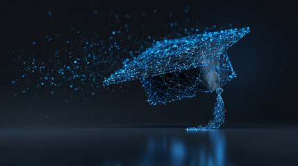 A digital representation of a graduation cap with glowing particles floating around it, symbolizing academic achievement and knowledge