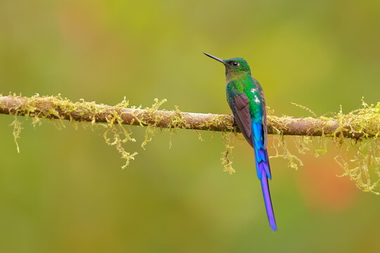 Violet-tailed Sylph - Aglaiocercus coelestis species of bird hummingbird in the coquettes, tribe Lesbiini of subfamily Lesbiinae, found in Colombia and Ecuador, very long blue color tail