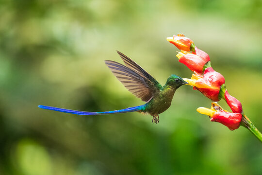long tailed sylph hummingbird aglaiocercus kingii nectaring on flower cloud forest ecuador