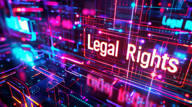Neon cyber design, "Legal Rights" text on digital interface, tech-focused, modern background, symbolic of digital law, cybersecurity.