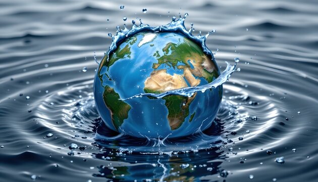 a world globe cracked open and filled with water, symbolic representation of global flooding.