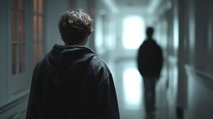 Teen boy walking away down a dim corridor, a shadowy figure of a friend behind, symbolic betrayal, cinematic mood, loneliness and tension, ultra-realistic, no watermark, no text