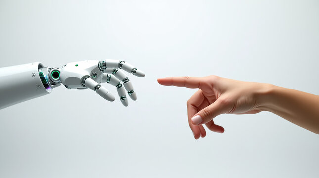 The futuristic image of a robotic hand reaching out to a human hand symbolizes future technologies.
