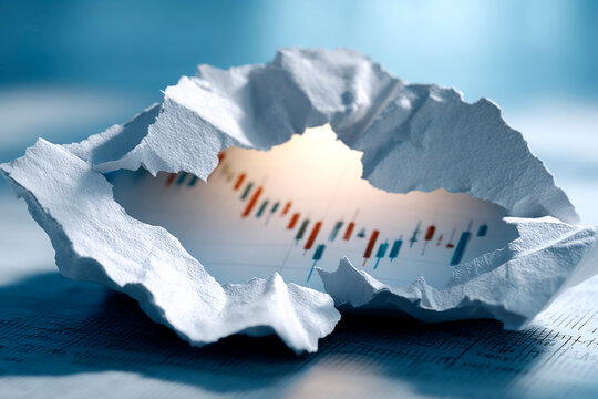 Financial data reflected on glass with shattered dollar symbol and clouds