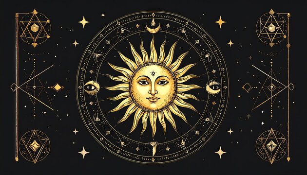 Golden sun with mystical symbols