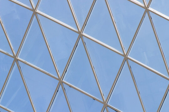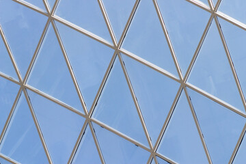 Geometric glass roof construction with blue sky, overhead view showcasing architectural design. Concept for modern architecture, futuristic designs and greenhouse structure