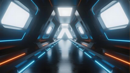 Futuristic neon-lit spacecraft corridor with alloy reflections