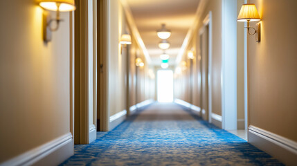 Long hotel corridor with blue carpet, yellow lighting, and doors on both sides, creating a symmetrical perspective.