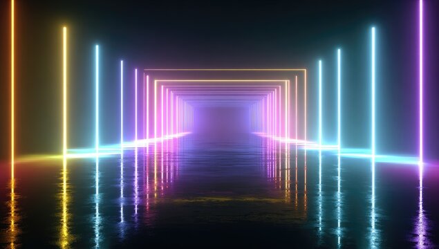 Glowing rectangular portals recede into a blurred, colorful vanishing point with mirrored floor reflections