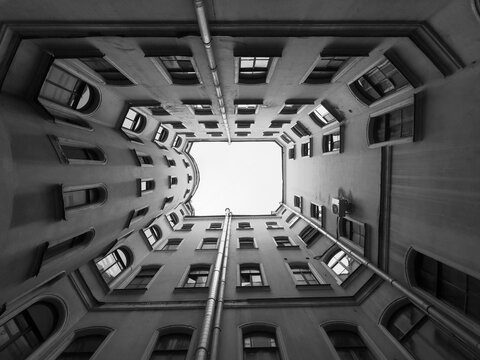 Black and white image of a narrow courtyard in an old building viewed from below, creating a tunnel effect with windows.