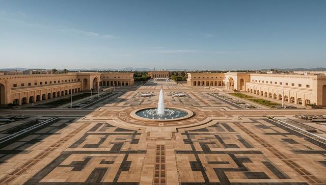 Serene courtyard three-tiered fountain amidst manicured gardens in symmetrical layout