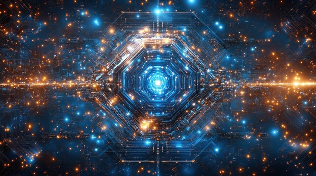 Abstract digital circuit board design, symmetrical pattern, glowing blue lines.