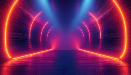 Futuristic glowing tunnel with neon orange and blue lights creating a symmetrical vibrant pathway with reflective floor and misty atmosphere