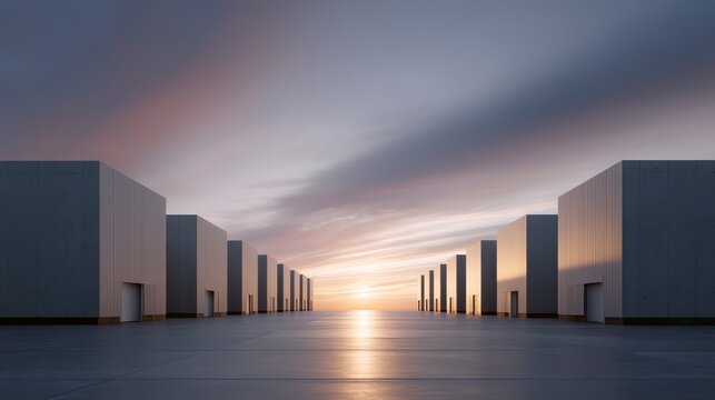 Geometric Pathway to Sunset: Architectural structures create a symmetrical pathway that leads toward a breathtaking sunset, blending geometry with the beauty of nature.