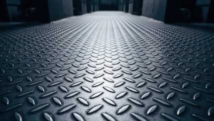 Metal floor with raised oval patterns, leading to a dark, receding vanishing point