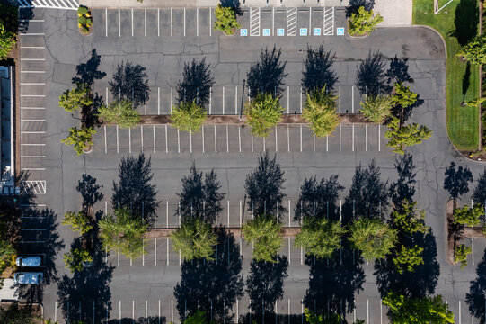Top-down aerial drone photo of a large empty commercial parking lot in Cedar Mill, Portland, Oregon, featuring symmetrical tree rows and marked parking spaces in bright sunlight