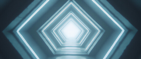Illuminated futuristic tunnel, neon lighting creating symmetrical triangles, reflecting on a glossy surface, dark ambiance, abstract