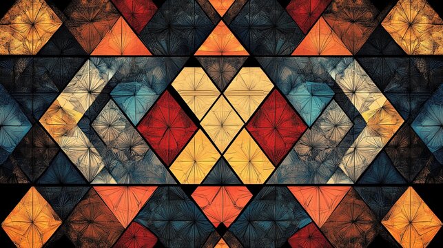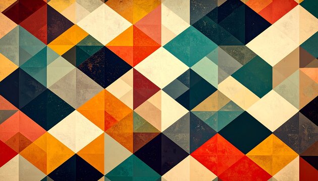 Abstract geometric pattern with colorful triangles and squares in a mosaic design, featuring a textured, vintage aesthetic.