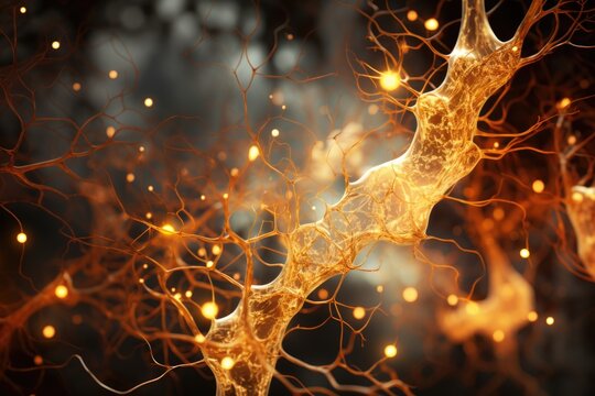 Glowing neuron structure with synaptic connections on dark background in digital style.