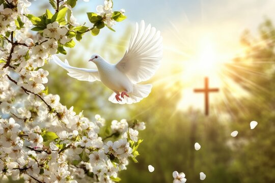 In a serene Easter scene, a white dove flies through a vibrant landscape of blossoming trees and a radiant cross, symbolizing the renewal, peace, and hope of spring and the joy of the celebration