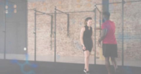 Empowered female athlete at gym with digital overlay