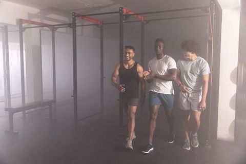 Group performing high-intensity plyometric workout in functional fitness gym with coach