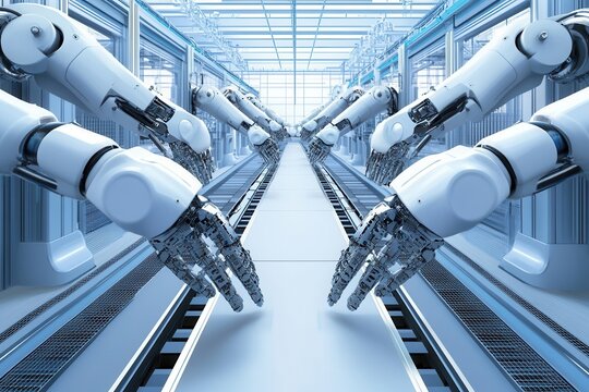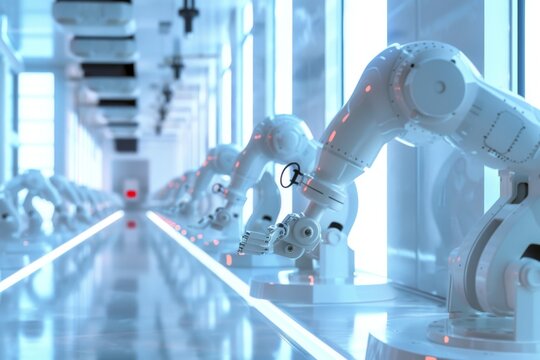 Automated Precision: A line of robotic arms diligently work in a modern industrial setting, their movements synchronized with precision and efficiency.
