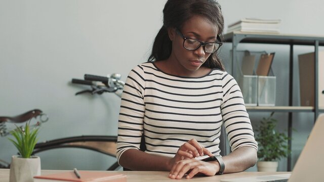 Young beautiful girl sitting in office at desk looking at notifications on her smart watch. Digital life.