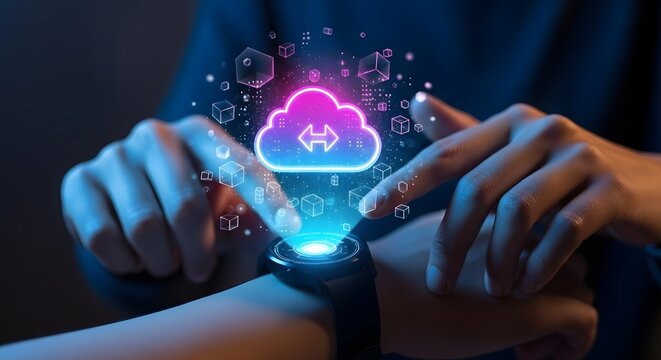 A person is using a smartwatch to access cloud services, showcasing the convenience and accessibility of modern data storage and transfer technology