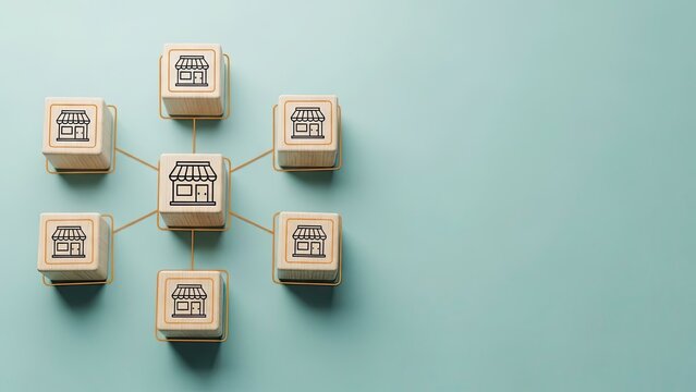 Connected business network with multiple store icons on wooden blocks