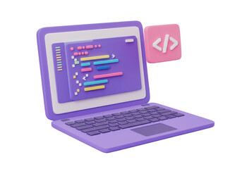 3d illustration of a laptop displaying code on screen with a pink coding icon, isolated on transparent background