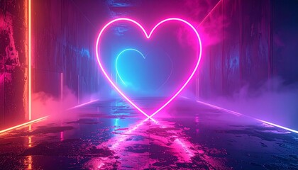 Glowing neon heart in a dark, misty, futuristic environment.