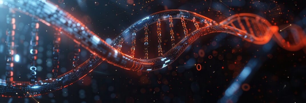 A dynamic portrayal of a DNA strand integrated with binary code and data streams, showcasing advancements in genetics and technology. Generative AI