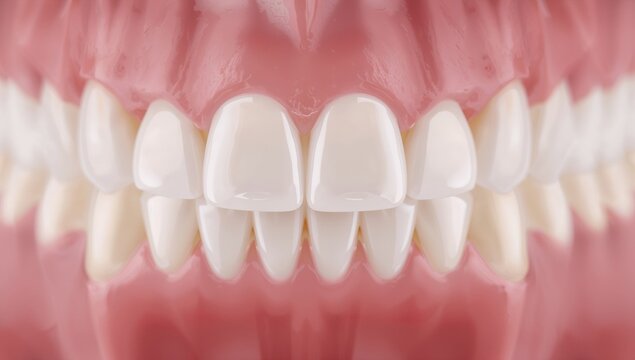 Thin ceramic coatings applied to teeth for cosmetic enhancement. Close-up view of dental prosthesis on a synthetic jaw, focusing on the lower teeth, illustrating a medical theme. The image has a