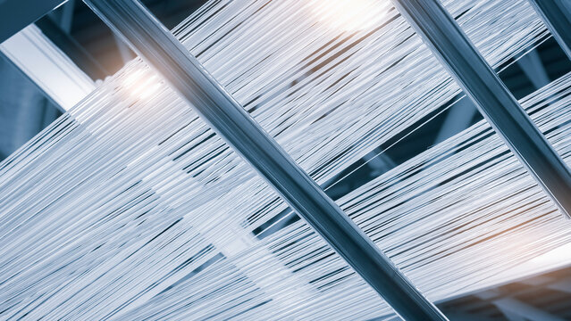 synthetic textile thread thread at industrial weaving manufacturing machine,  industrial concept background.