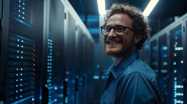 Smiling IT Manager in Data Center with Advanced Blue Server Technology