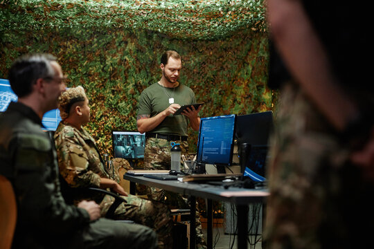 Military personnel employing the army satellite reconnaissance system to find any enemy warships or dangerous vessels. Navy IT engineers working in monitoring room general headquarters. Camera B.
