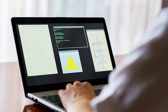Data management system, digital technology, software development concept. Computer programmer, software engineer coding on laptop with data center, database, computer server