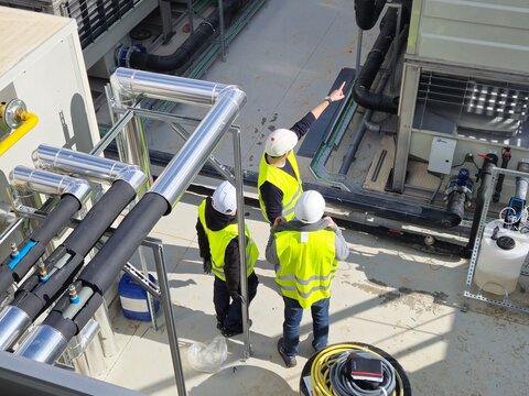 Three engineers in safety vests and hard hats are inspecting an industrial cooling system on a rooftop, discussing maintenance and pointing at potential issues