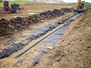 Installation of a leachate collection system under a new landfill with a liner and perforated rock.
