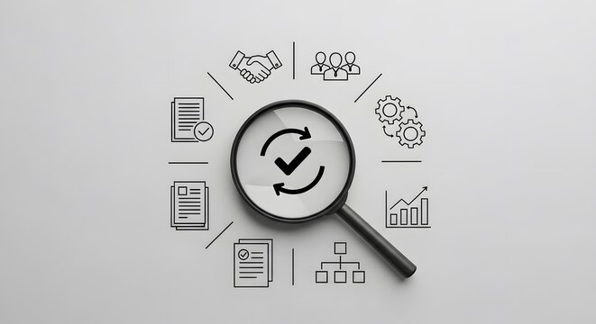 Business process improvement and compliance audit concept with a magnifying glass examining workflow quality, policy verification, and operational management systems