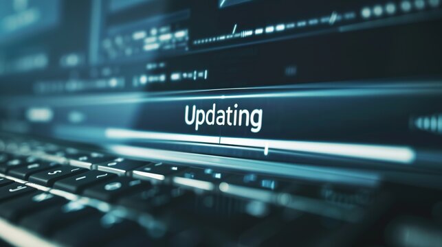 Close-up of computer screen showing software update progress bar with "Updating" text, keyboard and mouse visible in blurred background, modern technology and digital transformation concept.