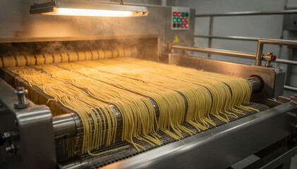 Medium shot of an industrial belt system gently moving pasta through a predrying stabilization zone evenly balancing moisture for consistent quality before final drying.
